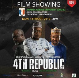 4th Republic sees Bako return to stories focused on Nigerian politics after playing in the romantic field with Road to Yesterday and The Royal Hibiscus Hotel. The director first came to limelight with his 2012 documentary Fueling Povertywhich focuses on the 2011’s Fuel Subsidy Scam.